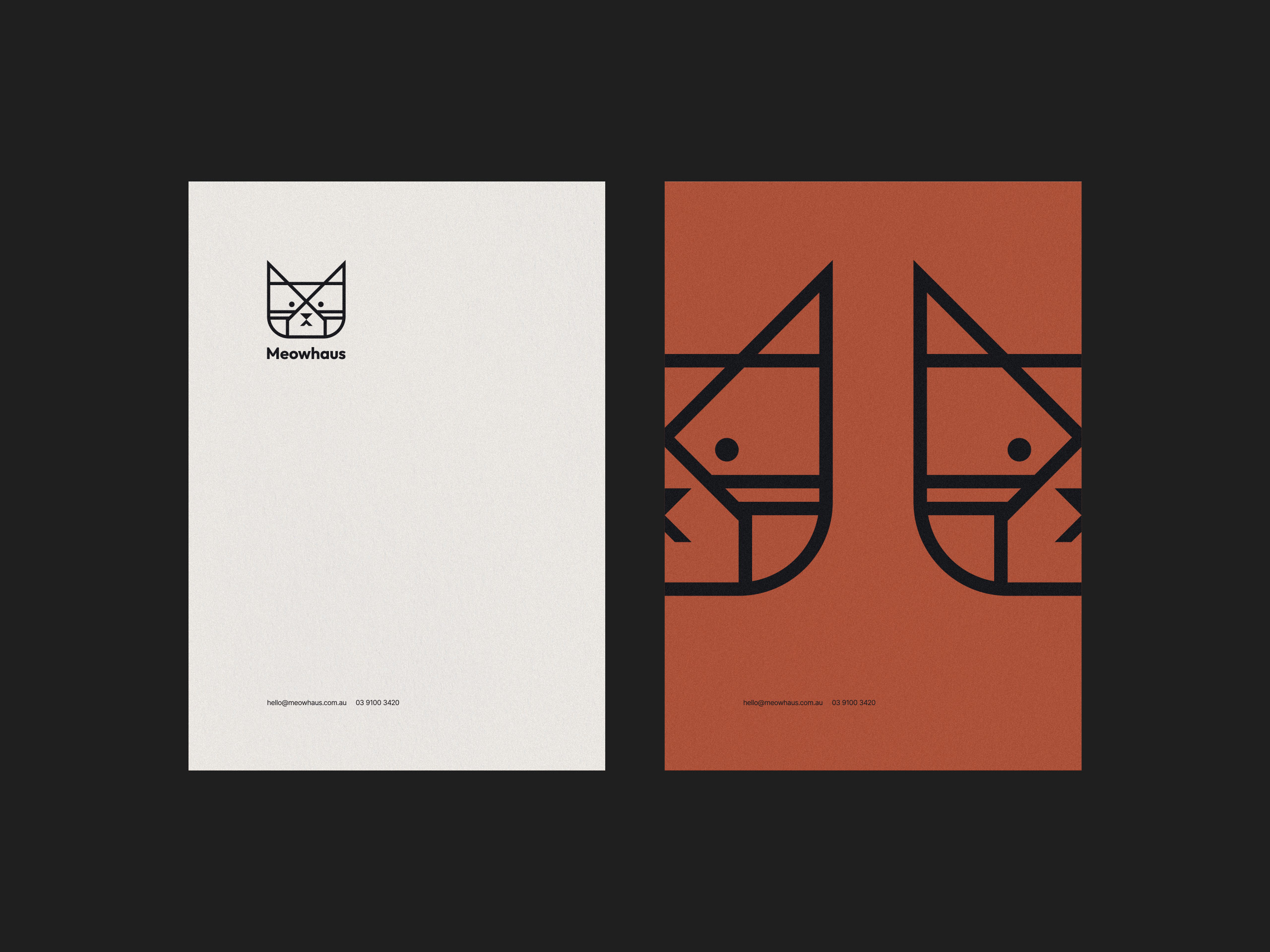 Because Brunswick is home to a few well-established catteries, it was important that Meowhaus arrive looking as fully-formed as possible to appear credibile. With little to no advertising spend, the logo would be the only signifier so it had to work extra hard to cut through and impress. Informed by a competitor audit and drawing insight from the owner’s personality and preferences, I developed an identity that abandons the common visual trappings preferred by local catteries and vet clinics.